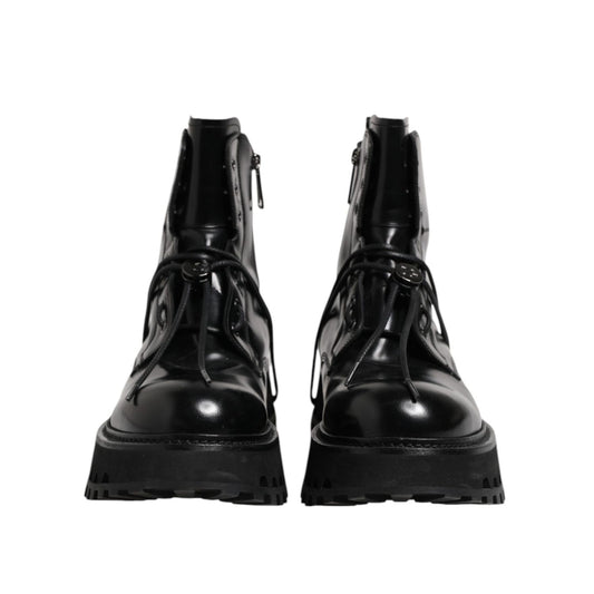 Dolce & Gabbana Black Leather Logo Ankle Boots Lace Up Shoes