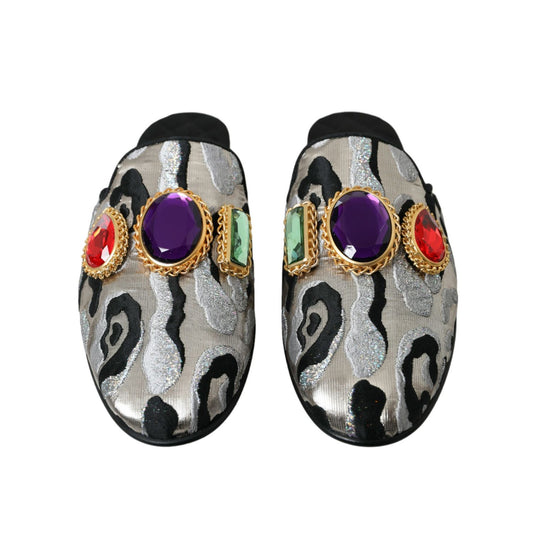 Dolce & Gabbana Gray Jacquard Crystal Mule Flat Sandals Shoes