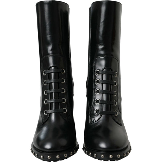 Dolce & Gabbana Black Leather Studded Lace Up Boots Shoes