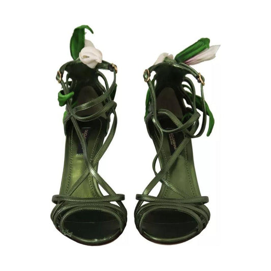 Dolce & Gabbana Acid Green Leather Strappy Flower Heels Sandals Shoes