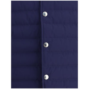 Brunello Cucinelli’s Down Vest is a refined and practical garment featuring a high collar that offers protection and warmth. The front snap-button closure ensures a secure and comfortable fit. The two side buttoned welt pockets and front welt pocket add functional and stylish details. The monochrome pattern gives a stylish and versatile look, while the quilted design and all-over padding provide warmth and comfort. An ideal vest for a sophisticated yet functional look for colder days.