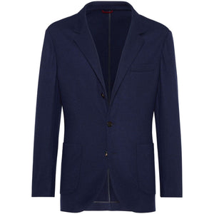 navy blue cashmere notched lapels front button fastening long sleeves buttoned cuffs jetted chest pocket two side patch pockets English rear vents Cashmere single-breasted jacket