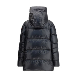 Cypress Jacket by Canada Goose, padded and quilted design, adjustable drawstring hood, front zipper closure, contrasting brand signature appliqué on puller, iconic brand monogram patch appliqué on arm, two zippered welt pockets on front, zippered side slits.