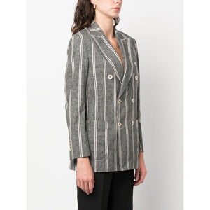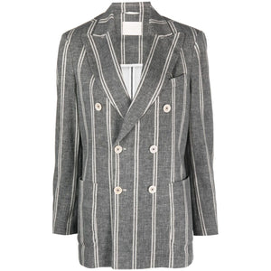 double-breasted striped blazer from CIRCOLO 1901 featuring dark grey, white, stretch-cotton, vertical stripe pattern, notched lapels, double-breasted button fastening, long sleeves, buttoned cuffs, chest welt pocket and two front patch pockets. Striped double-breasted jacket Size and Fit - This piece fits true to size. We recommend you get your regular size. Model is 1,75m / 5ft 8in wearing size 40 (IT)