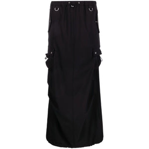 black low-rise drawstring waist D-ring findings rear slit side cargo pocket two press-stud fastening side pockets rear flap pocket floor-length Tailored cargo maxi skirt Size and Fit - This piece fits true to size. We recommend you get your regular size. Model is 1,75m / 5ft 8in wearing size 36 (FR)