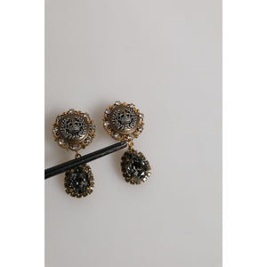 Dolce & Gabbana Gold Brass Crown Medallion Black Crystal Drop Clip On Earrings