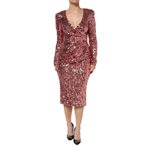 Dolce & Gabbana Pink Sequin Statement Nylon Midi V-Neck Dress