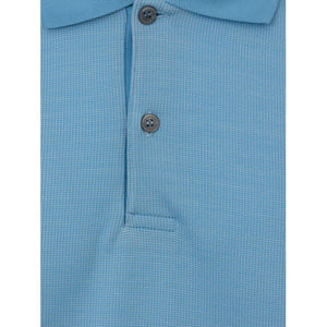 Dunhill Sky Blue Cotton Polo. In jacquard cotton/silk fabric with micro print, knitted collar and cuffs, front fastening with buttons. Regular fit