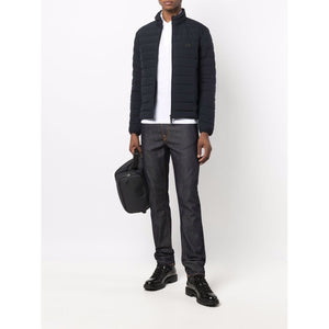 Navy blue feather down padded logo-patch jacket from EMPORIO ARMANI featuring padded design, logo patch to the side, front zip fastening, long sleeves and high neck. Zipped short down jacket Size and Fit - This piece fits true to size. We recommend you get your regular size. Model is 1,84m / 6ft 1in wearing size 48 (IT)