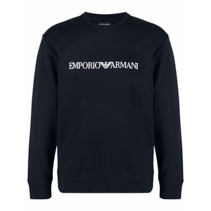 Navy blue modal-cotton blend logo-print crew-neck sweatshirt from EMPORIO ARMANI featuring jersey fleece, logo print to the front, crew neck, long sleeves and straight hem. POSITIVELY CONSCIOUS: This Planet Conscious product contains at least 50% eco-materials, which are independently certified as or widely recognised for having a lower environmental impact.. Logo cotton sweatshirt Size and Fit - This piece fits true to size. We recommend you get your regular size. Model is 1,84m / 6ft 1in wearing size M