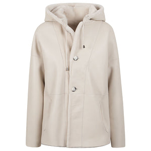 Jacket with hood, long sleeves, dropped shoulders, front button closure and two welt pockets. Fur hooded jacket Size and Fit - This piece fits true to size. We recommend you get your regular size. Model is 1,75m / 5ft 8in wearing size 36 (FR)
