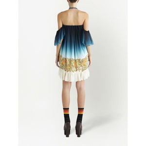 paisley-print silk dress from ETRO featuring blue, multicolour, silk, gradient effect, paisley print, gradient effect, ruffled detailing, off-shoulder, long sleeves and curved hem. Printed silk mini dress Size and Fit - This piece fits true to size. We recommend you get your regular size. Model is 1,75m / 5ft 8in wearing size 40 (IT)