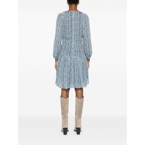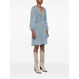 turquoise blue-green/multicolour cady texture all-over graphic print V-neck semi-sheer sleeves elasticated cuffs gathered detailing pleated skirt full lining curved hem above-knee length Ruline short dress Size and Fit - This piece fits true to size. We recommend you get your regular size. Model is 1,75m / 5ft 8in wearing size 36 (FR)
