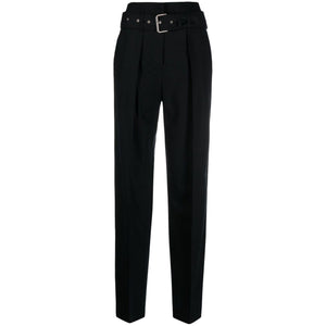 belted tailored trousers from IRO featuring black, wool blend, stretch-design, pleat detailing, pressed crease, high waist, belted waist, buckle fastening, two side slit pockets, two rear button-fastening jetted pockets, tailored cut and straight hem. Benet high-waisted trousers Size and Fit - This piece fits true to size. We recommend you get your regular size. Model is 1,75m / 5ft 8in wearing size 36 (FR)