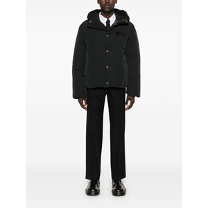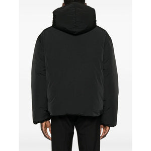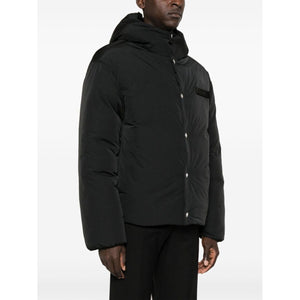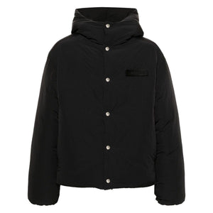 black shell padded design classic hood funnel neck long sleeves elasticated cuffs detachable appliqué logo to the chest two side inset pockets multiple internal slip pockets full lining drawstring hem concealed front zip fastening logo studs front press-stud fastening La Doudoune down jacket Size and Fit - This piece fits true to size. We recommend you get your regular size. Model is 1,84m / 6ft 1in wearing size 48 (IT)