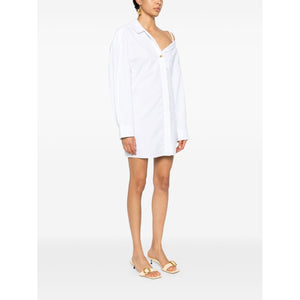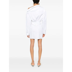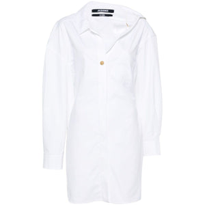 optical white cotton poplin texture asymmetric neck classic collar adjustable shoulder strap long sleeves press-stud fastening cuffs chest patch pocket belted waist straight hem front press-stud fastening La Mini Robe Chemise dress Size and Fit - This piece fits true to size. We recommend you get your regular size. Model is 1,75m / 5ft 8in wearing size 36 (FR)