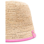 beige/pink woven raffia design leather trim flat crown dropped wide brim press stud-fastening tab leather logo patch to the front gold-tone hardware Le Bob Soli bucket hat Size and Fit - CIRCUMFERENCE: 58.0 Centimetres.