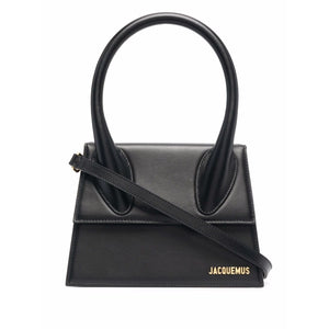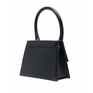Black leather Le Grand Chiquito tote bag from JACQUEMUS featuring single rounded top handle, gold-tone logo lettering, tonal stitching, adjustable detachable shoulder strap, foldover top with magnetic fastening, internal logo patch and internal slip pocket. Le Grand Chiquito leather handbag Size and Fit - Width 9,37 in / 23,8 cm Height 6,69 in / 17 cm Depth 3,74 in / 9,5 cm Handle 5,51 in / 14 cm Strap 19,29 in / 49 cm