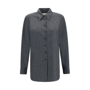 The Auryn Shirt by Khaite combines clean lines with refined materials for effortless elegance. Crafted from dark grey melange wool, it features a front button closure that enhances its understated sophistication. A versatile piece, ideal for elevating both casual and refined outfits.