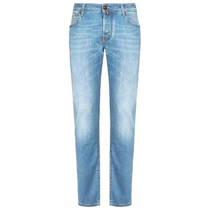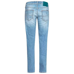 Jacob Cohën stretch jeans, faded blue Nick model, five-pocket model with logo embroidered on the pocket, orange button, aqua green suede patch
