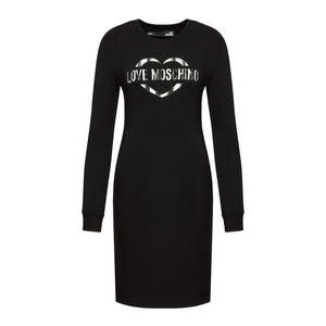 Embrace elegance and comfort with this chic long-sleeve dress from Love Moschino, featuring a striking metallic rubber logo on the chest. Carefully crafted from a soft cotton blend, this piece promises both style and ease for any occasion.