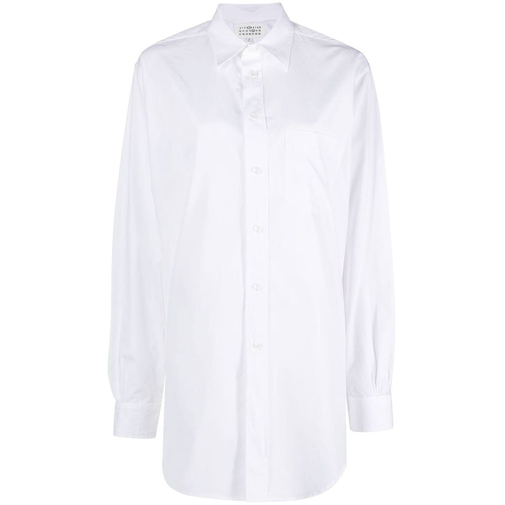long cotton poplin shirt from Maison Margiela featuring optical white, cotton, pointed flat collar, long sleeves, front button fastening and curved hem. Cotton shirt Size and Fit - This piece fits true to size. We recommend you get your regular size. Model is 1,75m / 5ft 8in wearing size 40 (IT)