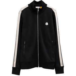 Moncler x Palm Angels sweatshirt in black color with side stripes, zipper closure. Embossed logo of the collaboration between the two brands, embossed writing on the back.