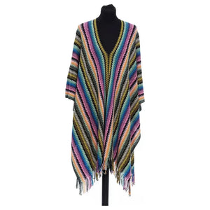 Experience the epitome of Italian chic with this Missoni fringed poncho, where geometric fantasies meet a kaleidoscope of colors. This exquisite piece combines functionality with high fashion, enveloping you in a luxurious blend of wool and marabou. The dynamic fringes add a playful touch to the sophisticated silhouette. Measuring a generous 100 cm x 45 cm plus fringes, it’s the perfect overlay for an unforgettable statement look. Elevate your wardrobe with Missoni’s blend of tradition and modernity.