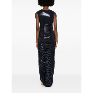 navy blue stretch-design glossy finish slash neck sleeveless ankle-length ankle-length Shirred long dress Size and Fit - This piece fits true to size. We recommend you get your regular size. Model is 1,75m / 5ft 8in wearing size S
