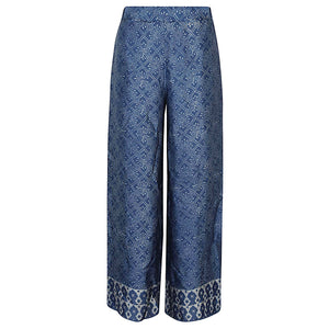 Wide leg trousers, with ethnic print, elastic waist and two side welt pockets. Printed silk trousers Size and Fit - This piece fits true to size. We recommend you get your regular size. Model is 1,75m / 5ft 8in wearing size S