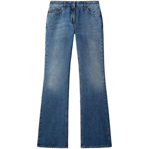 cotton flared jeans from OFF-WHITE featuring blue, cotton, stonewashed, logo patch to the rear, flared, front button and zip fastening and classic five pockets. Slim fit denim jeans Size and Fit - This piece fits true to size. We recommend you get your regular size. Model is 1,75m / 5ft 8in wearing size 27 (WAIST CM)