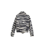 Retrofête Black/White Denim Short Jacket. Double-breasted front fastening with snap buttons, two side pockets, deep neckline, elastic waist, cropped, wide sleeve with elastic cuffs.
