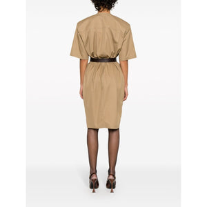 beige cotton V-neck front button fastening short sleeves two chest flap pockets belted waist two front flap pockets straight hem Cotton twill midi dress Size and Fit - This piece fits true to size. We recommend you get your regular size. Model is 1,75m / 5ft 8in wearing size 36 (FR)