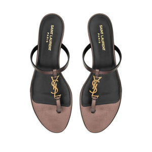cedar brown lambskin gold-tone logo plaque T-bar strap slip-on style branded footbed flat leather sole Cassandre leather thong sandals Size and Fit - Heel 2,4 in / 6 cm