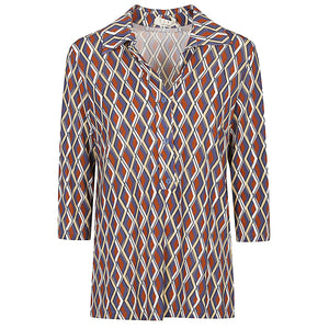Shirt made of viscose, multicolor, polo collar, front button closure, 3/4 sleeves, side slits, straight hem, relaxed fit. Selma blouse Size and Fit - This piece fits true to size. We recommend you get your regular size. Model is 1,75m / 5ft 8in wearing size 36 (ES)