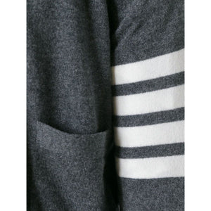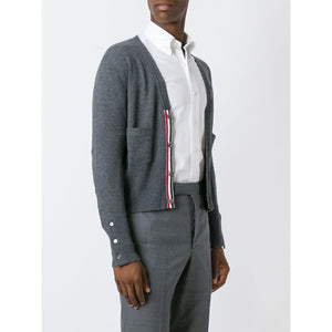 4-Bar cashmere cardigan from THOM BROWNE featuring medium grey, cashmere, knitted construction, ribbed trim, signature 4-Bar stripe, grosgrain ribbon trim, V-neck, two front patch pockets, long sleeves, front button fastening and straight hem. 4Bar cashmere cardigan Size and Fit - This piece fits true to size. We recommend you get your regular size. Model is 1,84m / 6ft 1in wearing size 2 (NUM)