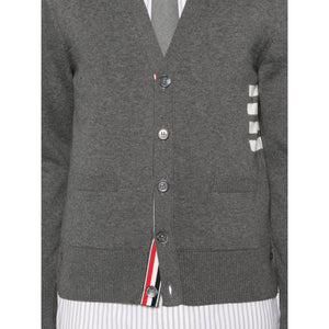 medium grey cotton fine knit signature 4-Bar stripe signature grosgrain loop tab signature grosgrain side tabs ribbed trim V-neck front button fastening long sleeves buttoned cuffs two side patch pockets straight hem 4Bar cotton cardigan Size and Fit - This piece fits true to size. We recommend you get your regular size. Model is 1,84m / 6ft 1in wearing size 2 (NUM)