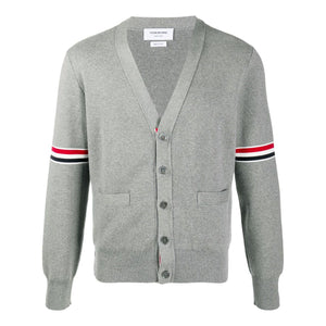 Light grey cotton Milano stitch stripe armband cardigan from THOM BROWNE featuring front button fastening, two front patch pockets, signature 4-Bar stripe, signature 4-Bar tab, long sleeves, buttoned cuffs, side button fastening and ribbed detailing. Rwb cotton cardigan Size and Fit - This piece fits true to size. We recommend you get your regular size. Model is 1,84m / 6ft 1in wearing size 2 (NUM)