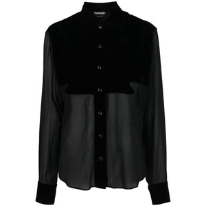 panelled buttoned silk shirt from TOM FORD featuring black, silk, semi-sheer construction, panelled design, spread collar, front button fastening, shirt sleeves and curved hem. Silk georgette shirt Size and Fit - This piece fits true to size. We recommend you get your regular size. Model is 1,75m / 5ft 8in wearing size 40 (IT)