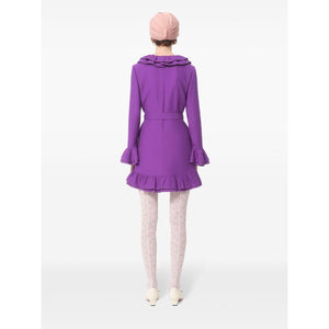 amaranth purple virgin wool-silk blend stretch-design ruffled detailing front tie fastening rear zip fastening V-neck long sleeves flared hem thigh-length Crepe couture short dress Size and Fit - This piece fits true to size. We recommend you get your regular size. Model is 1,75m / 5ft 8in wearing size 40 (IT)