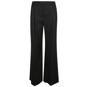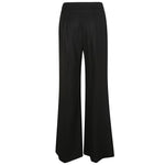 Black colour, solid colour, high waist with front closure, hidden zip and button, wide leg, two side welt pockets, straight hem. Wool blend trousers