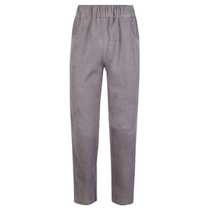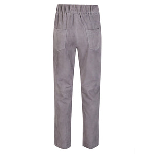 Gray trousers, elastic life, two front pockets, two pockets behind. Elastic waist suede trousers Size and Fit - This piece fits true to size. We recommend you get your regular size. Model is 1,75m / 5ft 8in wearing size 40 (IT)