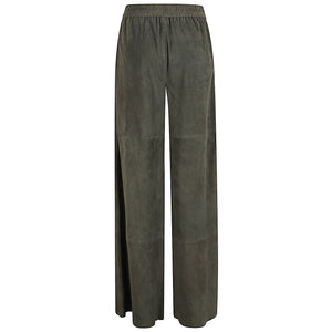 Dark green colour, made of leather, high elasticated waist, wide leg, decisive stitching, two side welt pockets. Suede leather trousers