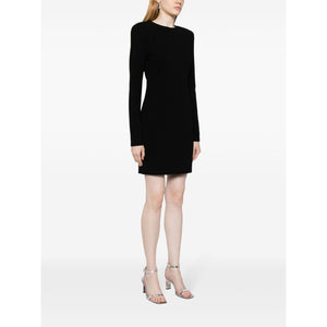 black virgin wool blend stretch-design crepe texture shoulder pads round neck concealed rear zip fastening long sleeves rear slit straight hem below-knee length Fitted mini dress Size and Fit - This piece fits true to size. We recommend you get your regular size. Model is 1,75m / 5ft 8in wearing size 8 (UK)