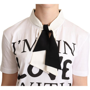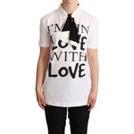 Gorgeous brand new with tags, 100% Authentic Dolce & Gabbana t-shirt with wide ascot collar is made of thin jersey based on soft cotton and durable silk. The “I’m in love with love” print on the front shelf is a ready-made slogan for Instagram.