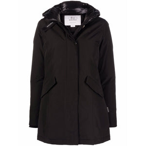 Black cotton blend/feather down Arctic padded parka from WOOLRICH featuring padded design, classic hood, concealed front button fastening, front flap pockets and long sleeves. Arctic parka Size and Fit - This piece fits true to size. We recommend you get your regular size. Model is 1,75m / 5ft 8in wearing size S