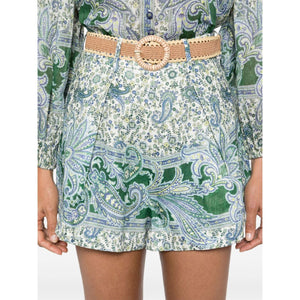 green/multicolour linen/flax pleat detailing Green Paisley print high waist belted waist belt loops concealed rear zip fastening two side slit pockets wide leg thigh-length This item contains at least 50% materials which are certified or widely recognised as having a lower environmental impact through production and/or manufacturing processes that reduce water consumption and the use of harmful chemicals, or re-use by-products of the production process. Learn more about what makes a product Conscious on our Conscious Criteria page Paisley print linen shorts Size and Fit - This piece fits true to size. We recommend you get your regular size. Model is 1,75m / 5ft 8in wearing size 1 (NUM)
